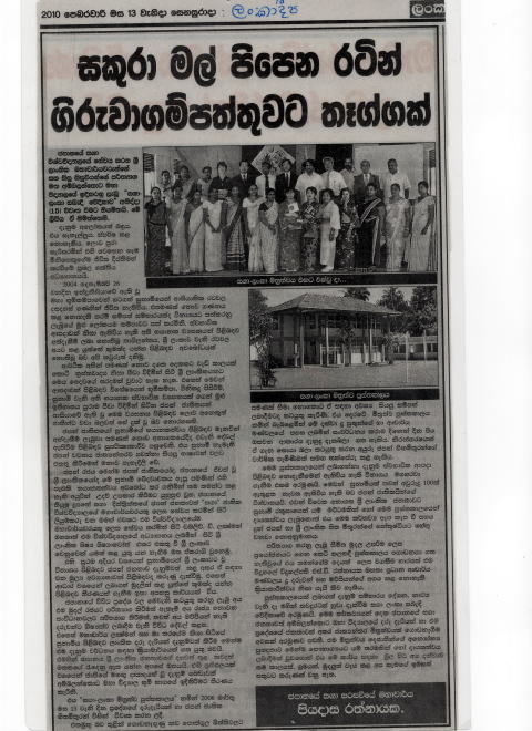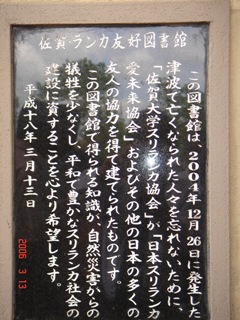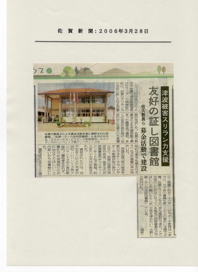 その結果、佐賀大学のスリランカ人留学生を始め佐賀市民および新潟県の山崎直子その地域の方々と協力して募金活動を行いスリランカ南部にあるアンバラントタ高校に近代的な二階建ての図書館を建てました。
